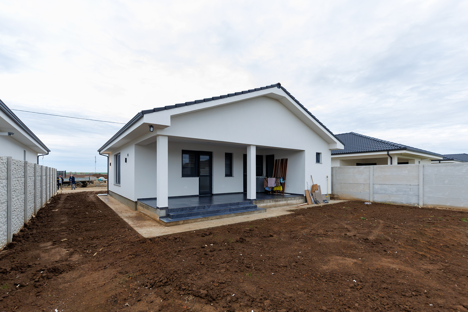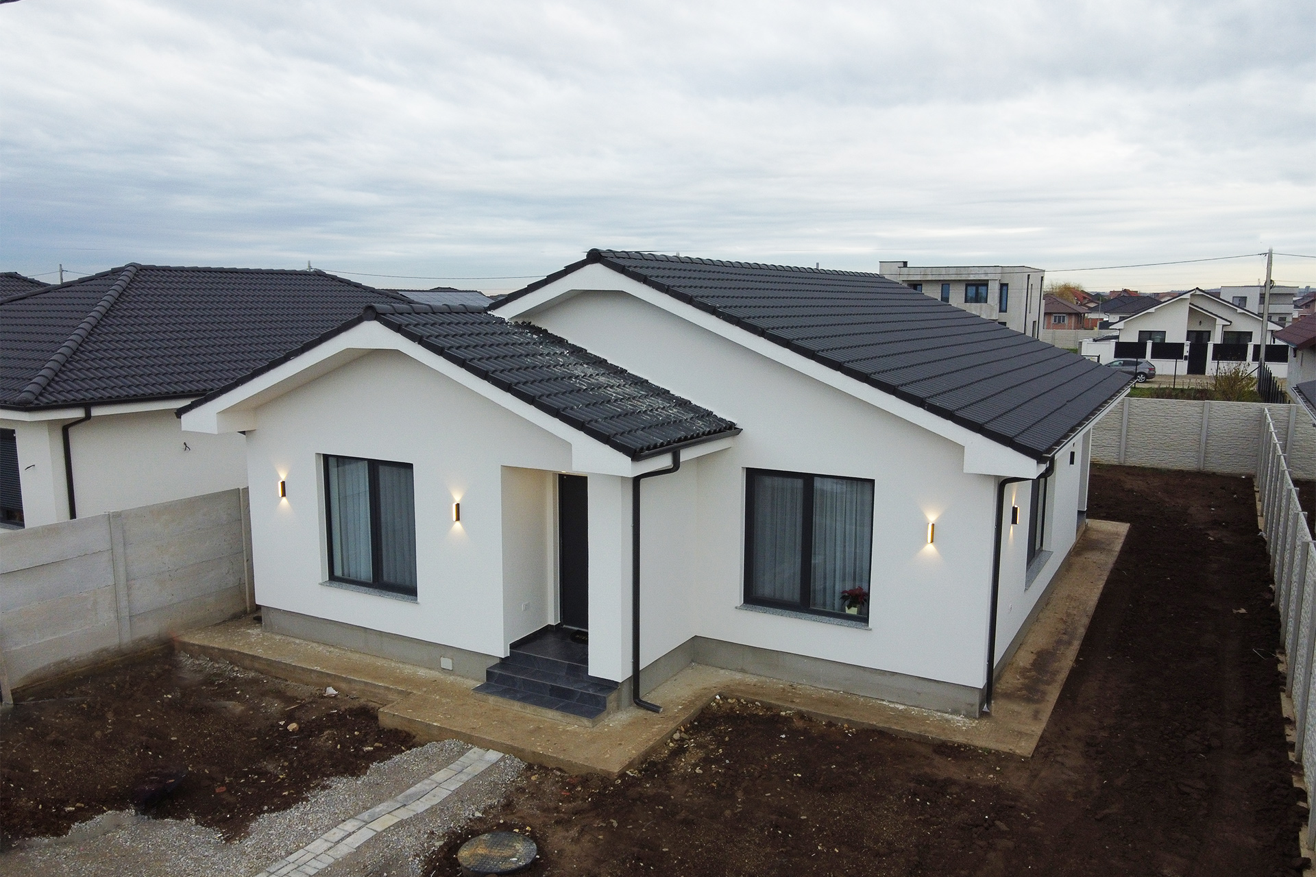 Acoperișul este realizat cu țiglă din Incop de beton, un material extrem de rezistent la intemperii, variații de temperatură și acțiunea timpului. Asigură o protecție solidă a locuinței, stabilitate structurală și un aspect estetic modern și durabil.