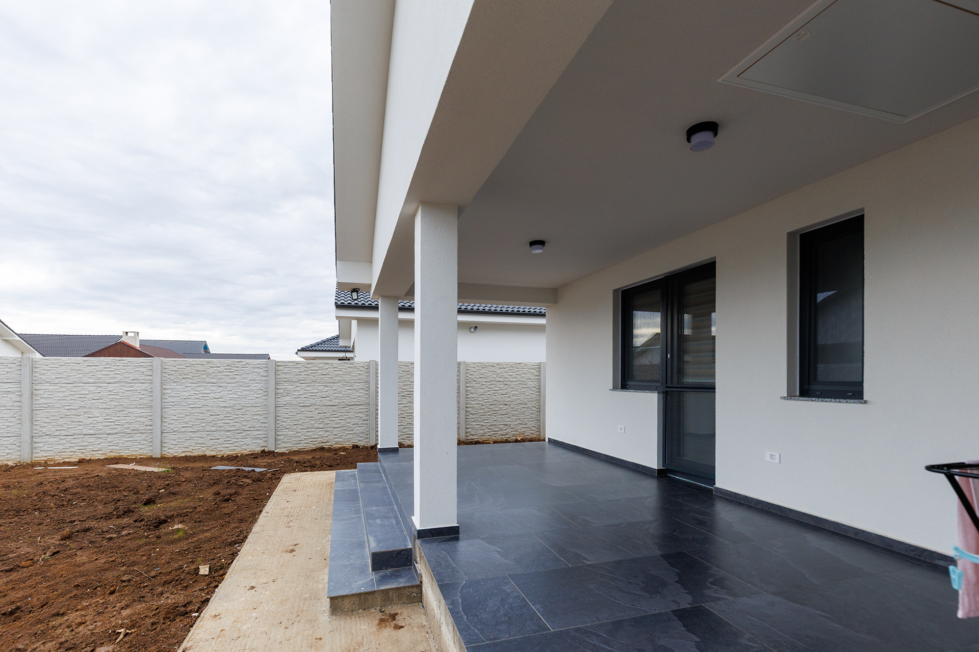 Pervazele exterioare sunt realizate din granit natural, un material premium, extrem de rezistent la intemperii, șocuri mecanice și uzură, care completează elegant fațada casei.