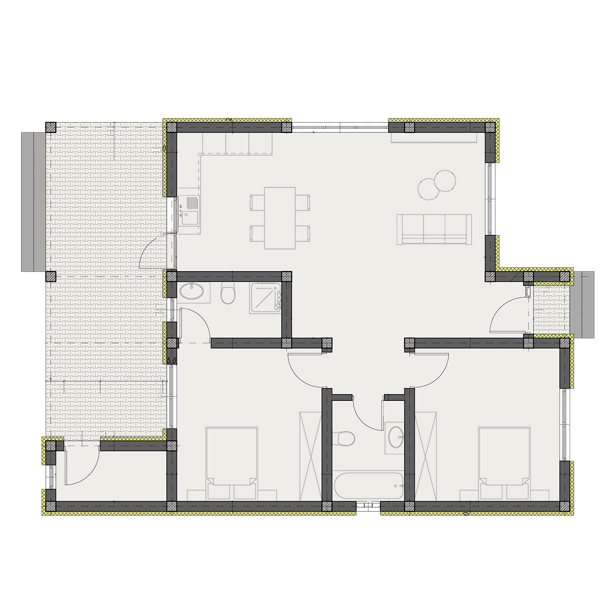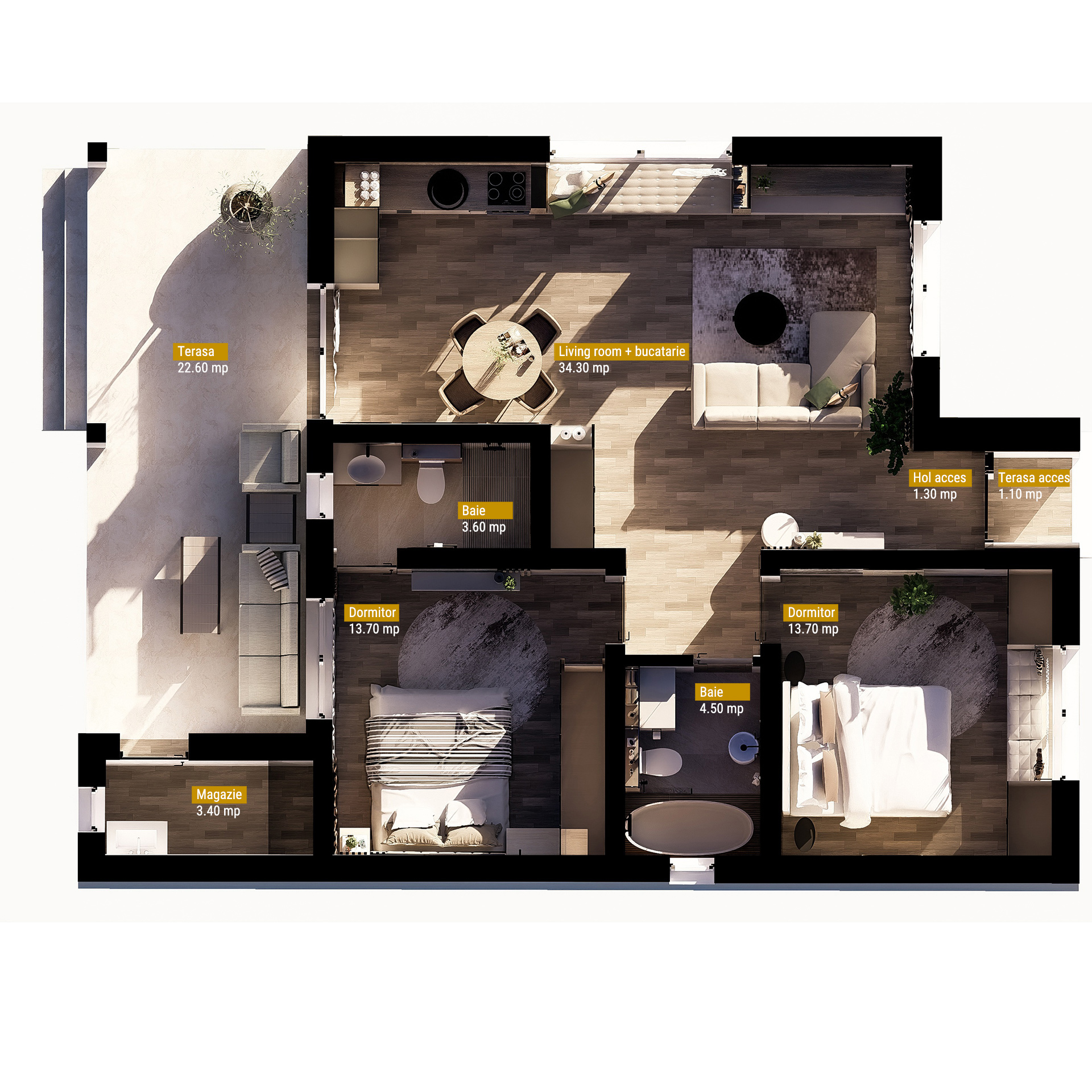 Spațiu generos acolo unde contează: living deschis cu bucătărie, două băi și o terasă mare, perfectă pentru momentele în familie.