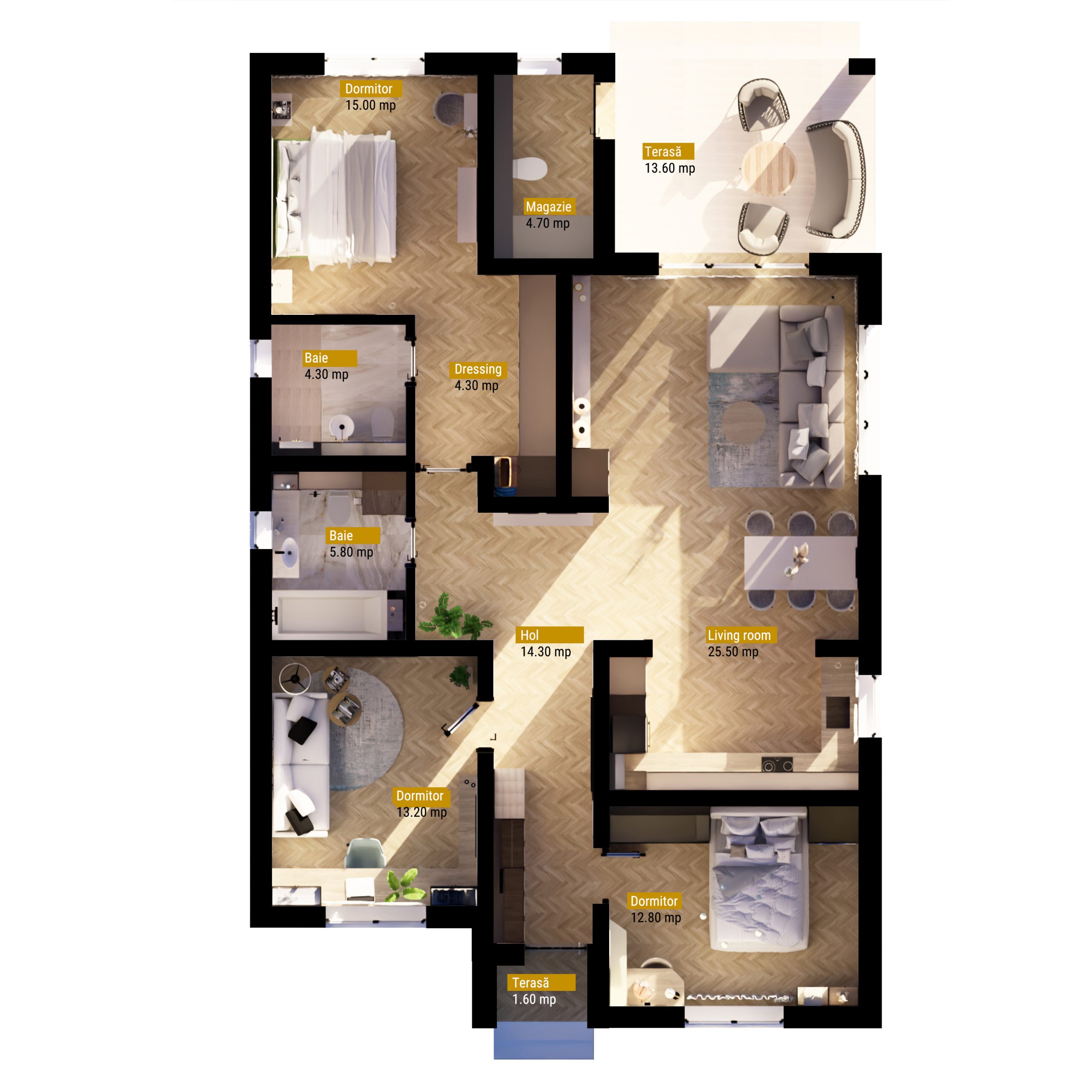 Compartimentare eficientă, cu trei dormitoare, două băi și o separare clară între zona de zi și cea de noapte.